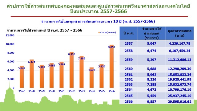 ในปีงบประมาณ 2566 มีทรัพยากรสารสนเทศด้านทรัพยากรและสิ่งแวดล้อม จำนวน 5 รายชื่อ (เนื่องจากมีหนังสือด้านทรัพยากรและสิ่งแวดล้อมจำหน่ายจำนวนน้อย) และเรื่องที่เกี่ยวข้องสำหรับให้บริการด้านวิทยาศาสตร์และเทคโนโลยี จำนวนมากกว่า 9,000 รายชื่อ