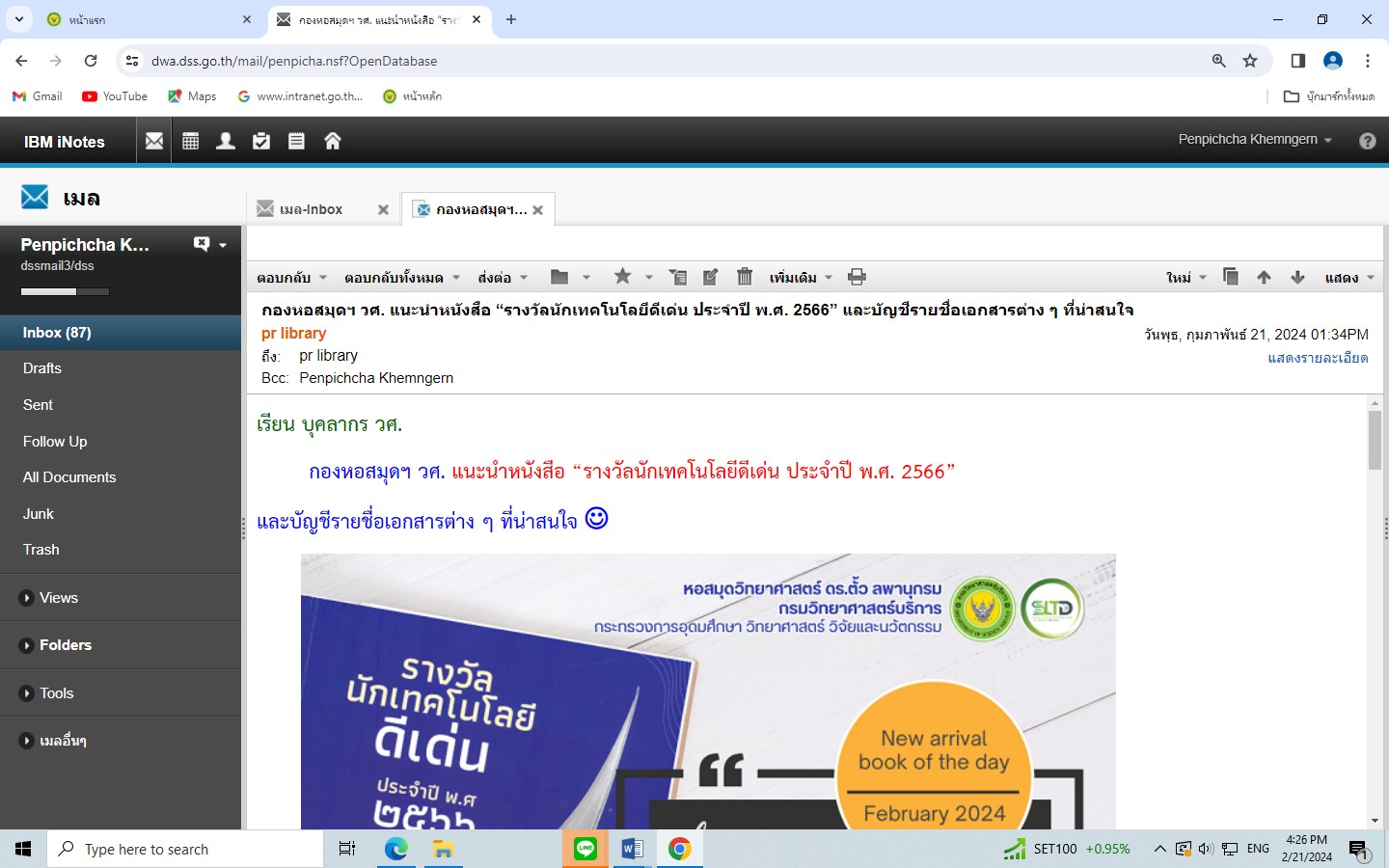 1. กองหอสมุดฯ เป็นต้นแบบการนำระบบสารบรรณอิเล็กทรอนิกส์แทนการใช้กระดาษในกรมวิทยาศาสตร์บริการ โดยส่งเอกสารแจ้งเวียนทางไลน์/ e-mail/e sarabun โดยสามารถเข้าดูหนังสือได้ที่ http://bsti-saraban.dss.local/ (ชื่อผู้ใช้งาน และ รหัสผ่าน ใช้อันเดียวกันกับที่ Login เข้าใช้งานคอมพิวเตอร์) เลือกเมนู หนังสือเวียน