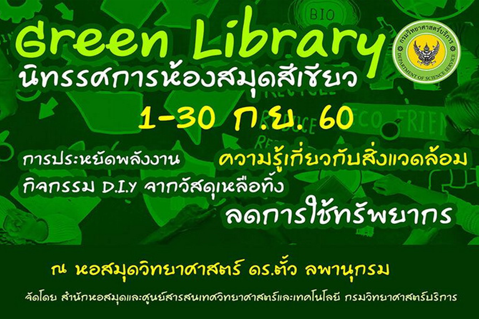 นิทรรศการ “Kick Off ห้องสมุดสีเขียว ตั้งแต่วันที่ 1 - 30 กันยายน 2560 ณ ชั้น 1 หอสมุดวิทยาศาสตร์ ดร.ตั้ว ลพานุกรม กรมวิทยาศาสตร์บริการ การจัดนิทรรศการครั้งนี้ หอสมุดวิทยาศาสตร์ฯ ได้บูรณาการกับ
